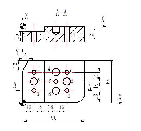 本实例中零件图及毛坯位置图如图3-2所示,其中,#1、#2、#5、#6、#7、#8、孔深10mm,#3、#4、#9为通孔。由于零件较小,外形规则,采用平口钳装夹即可,选择以下四种刀具进行加工:1号刀为φ50mm端铣刀,用于铣上表面; 2号刀为φ20mm立铣刀,用于铣左台阶面; 3号刀为φ6mm钻头, 4号刀为φ11mm钻头,用于加工孔。通过测量刀具,设定补偿值用于刀具补偿。该零件工艺规程见表3-3,工件坐标系的建立,参考点及程序零点的确定如图3-2所示。